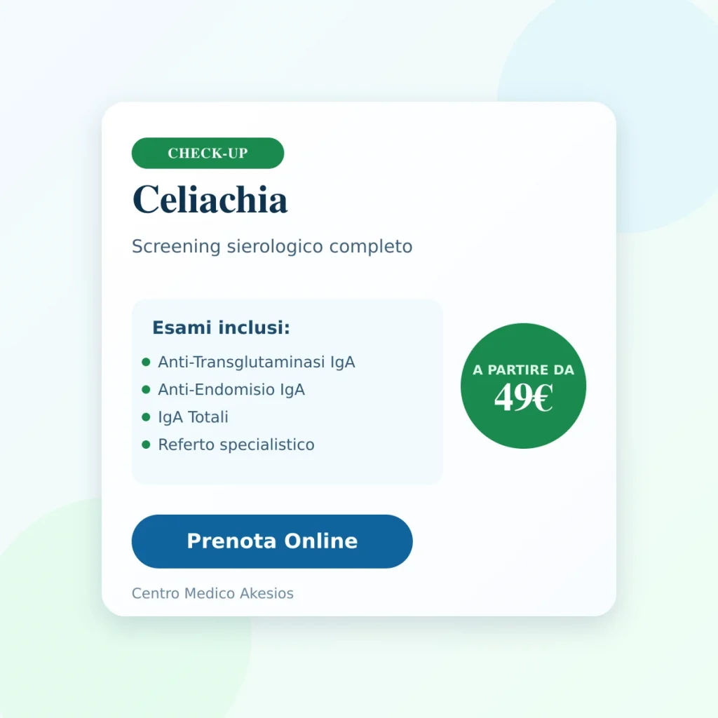 Il pacchetto Check-Up Celiachia include: Immunoglobuline IgA, Anti transglutaminasi IgA, Anti endomisio IgA, Anti gliadina.