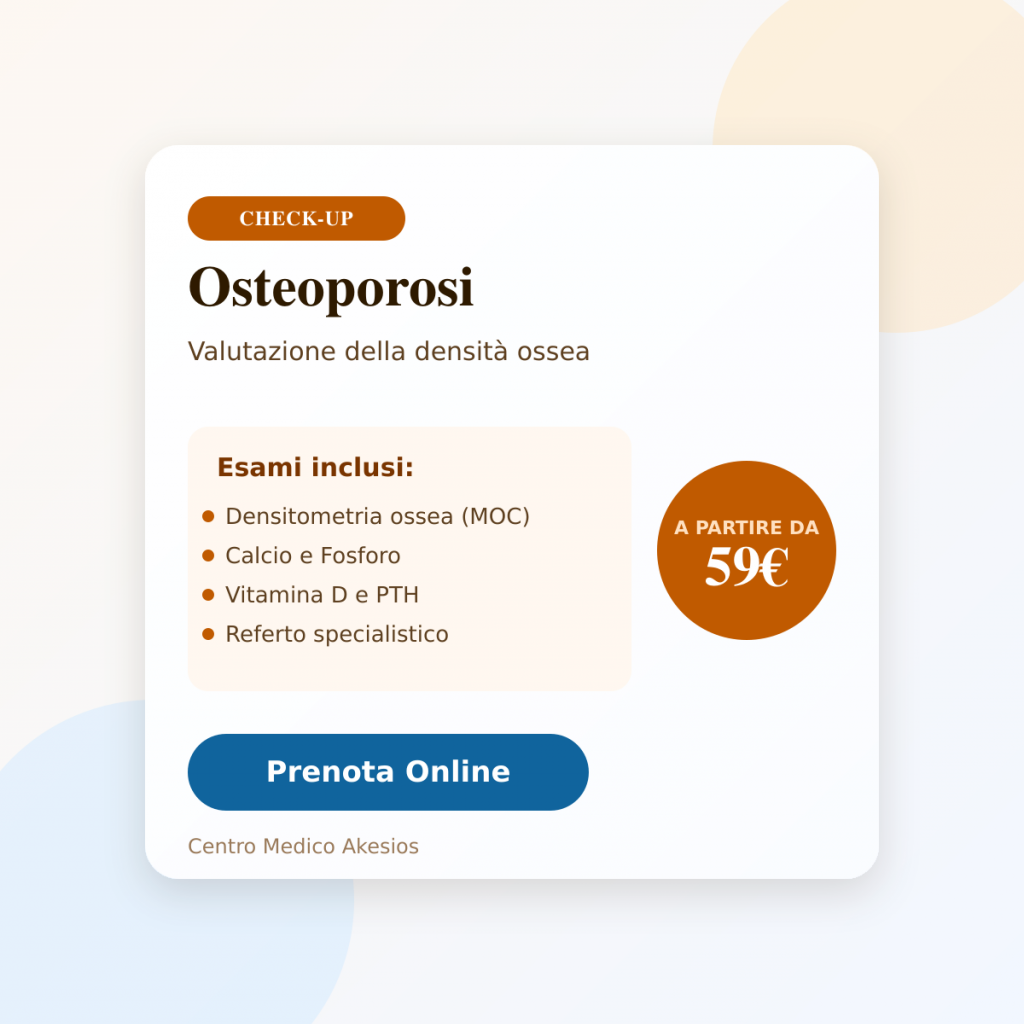 Il pacchetto Check-Up Osteoporosi include: Emocromo, Elettroforesi Proteica, Creatinina, PTH, Vitamina D 25-OH, Fosforemia, TSH Reflex, Calcio.