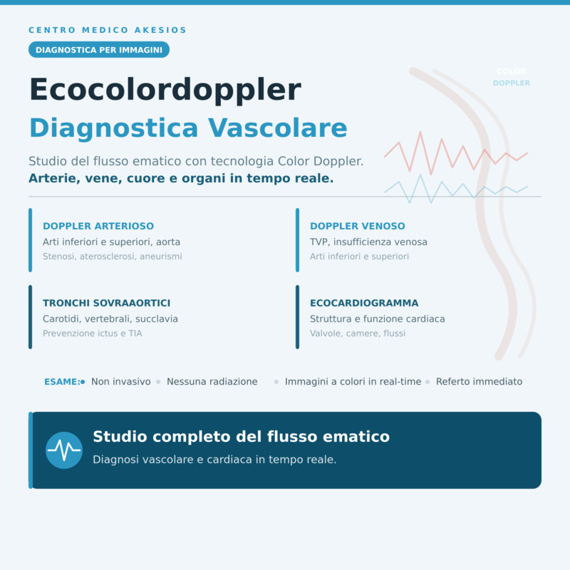 ecocolordoppler dei tronchi sovraaortici è uno degli esami di diagnostica per immagini più importanti nell'ambito della prevenzione cardiovascolare e cerebrovascolare. Attraverso l'utilizzo combinato degli ultrasuoni e della tecnologia Doppler a colori, consente di visualizzare in tempo reale la morfologia e la funzionalità delle principali arterie che irrorano il cervello: le